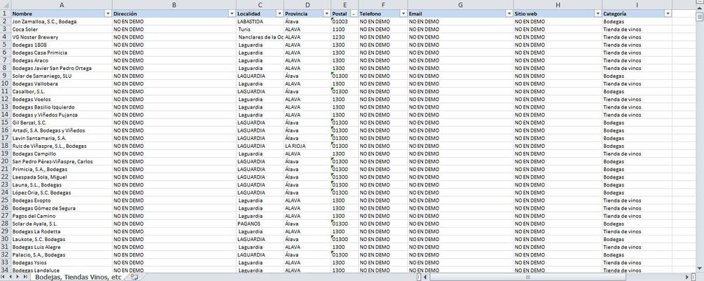 Completa Base de datos de 3500 Bodegas, Tiendas de Vinos de España, organizada en formato Microsoft Excel, con todos los datos de contacto.