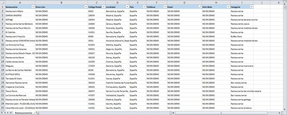Completa Base de datos de 11.560 Restaurantes de España, organizada en formato Microsoft Excel, con todos los datos de contacto.